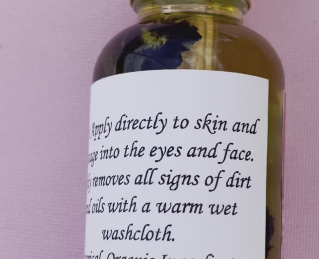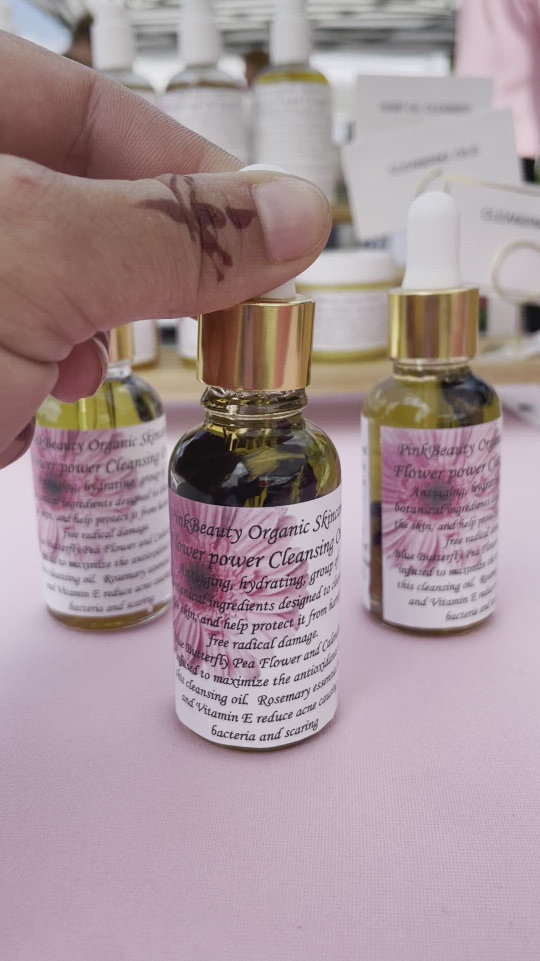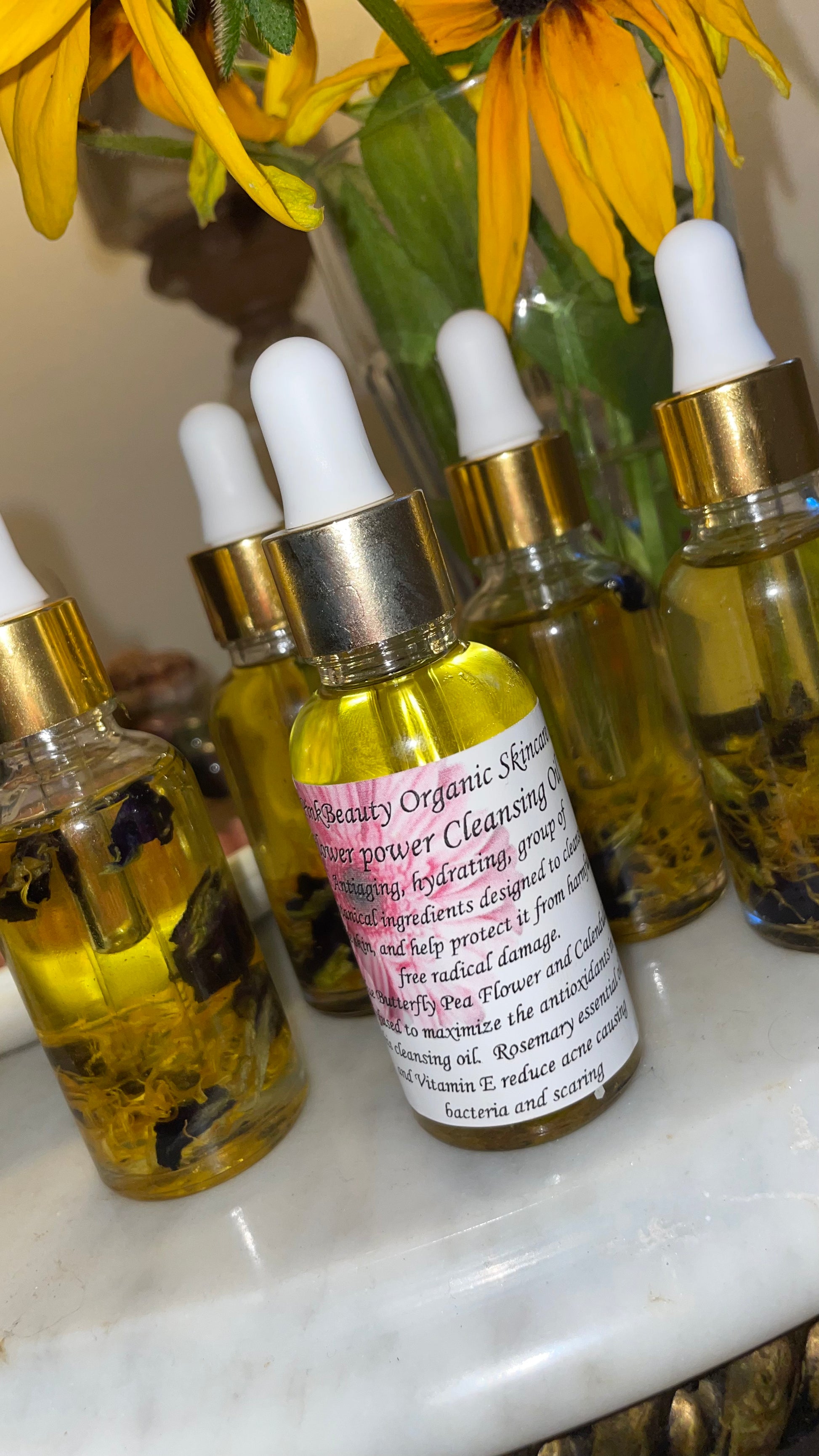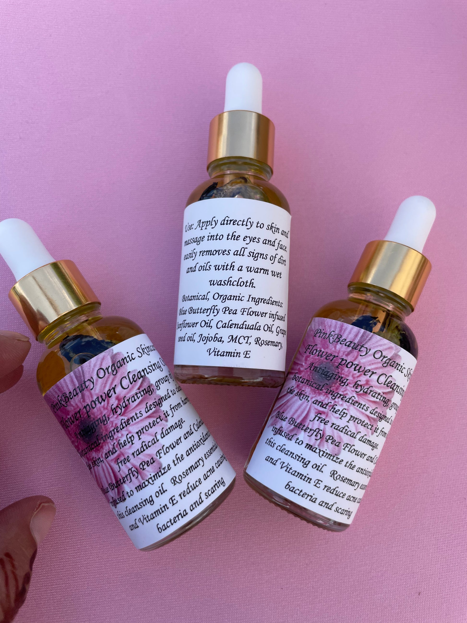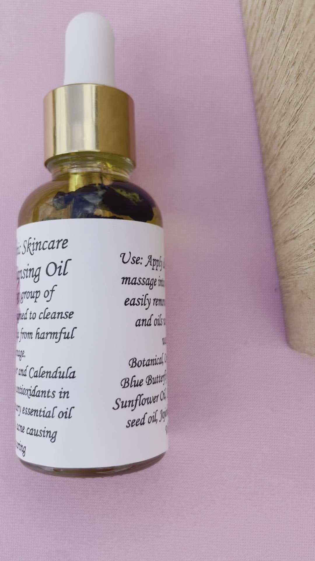 Antiaging hydrating group of botanical ingredients design to cleanse the skin to help protect it from harmful free radical damage blue butterfly pea flower and Calen Doula infused to maximize the antioxidants in this cleansing oil rosemary essential oil in vitamin E reduce acne causing bacteria and scaring