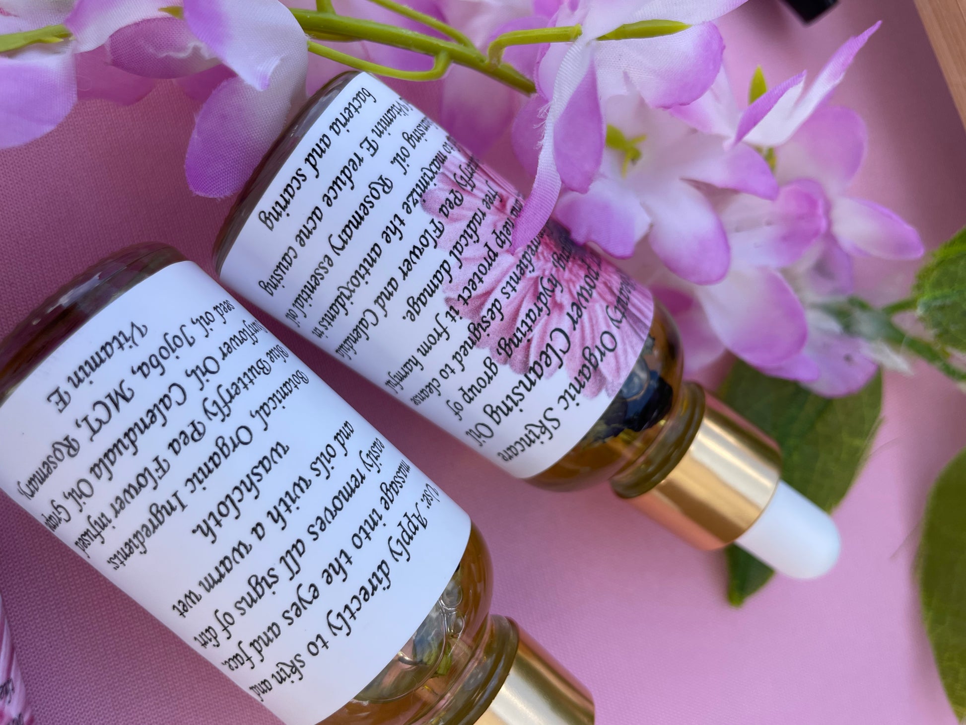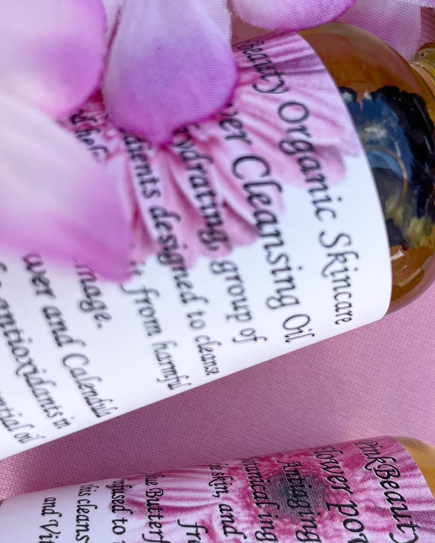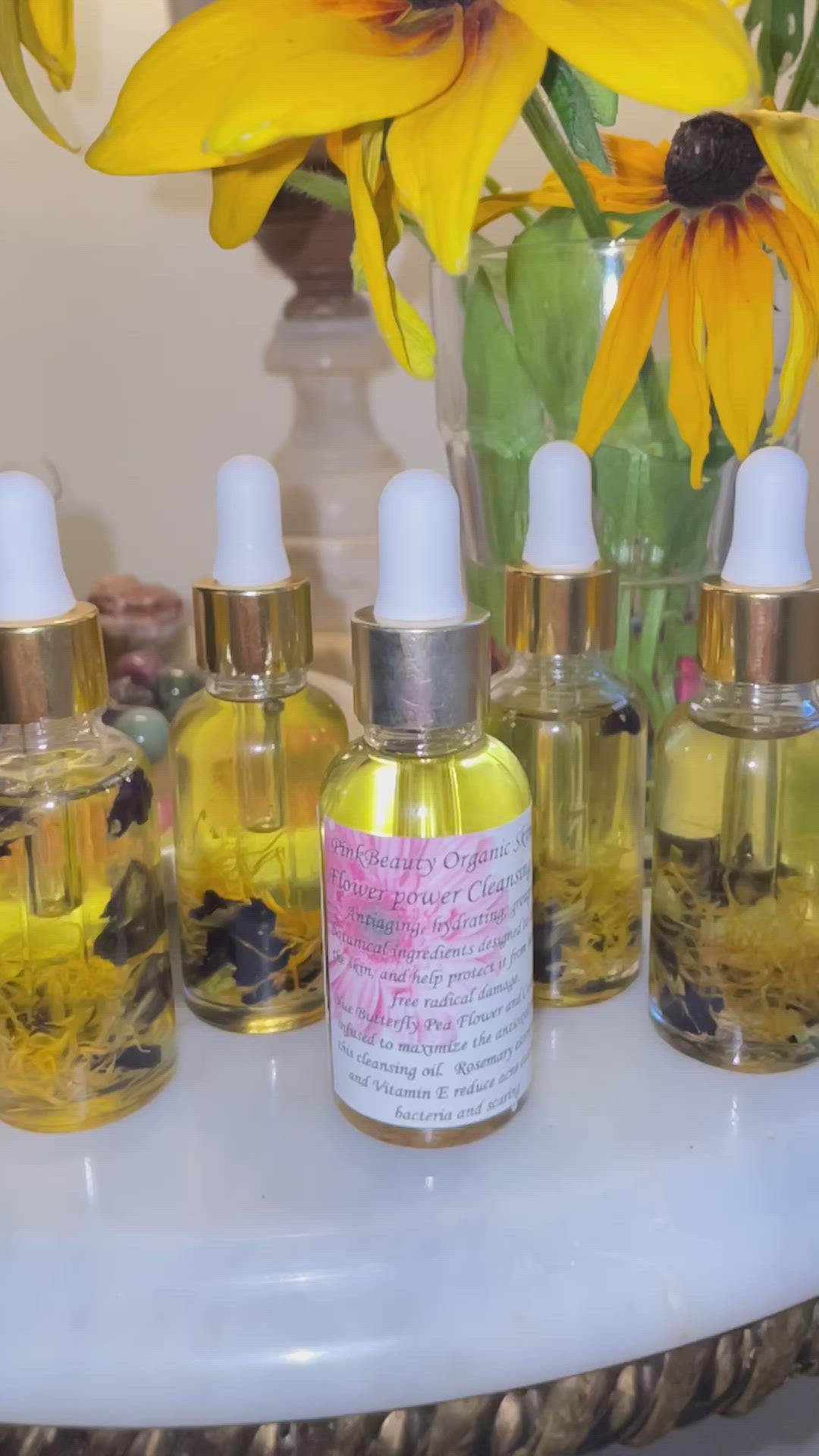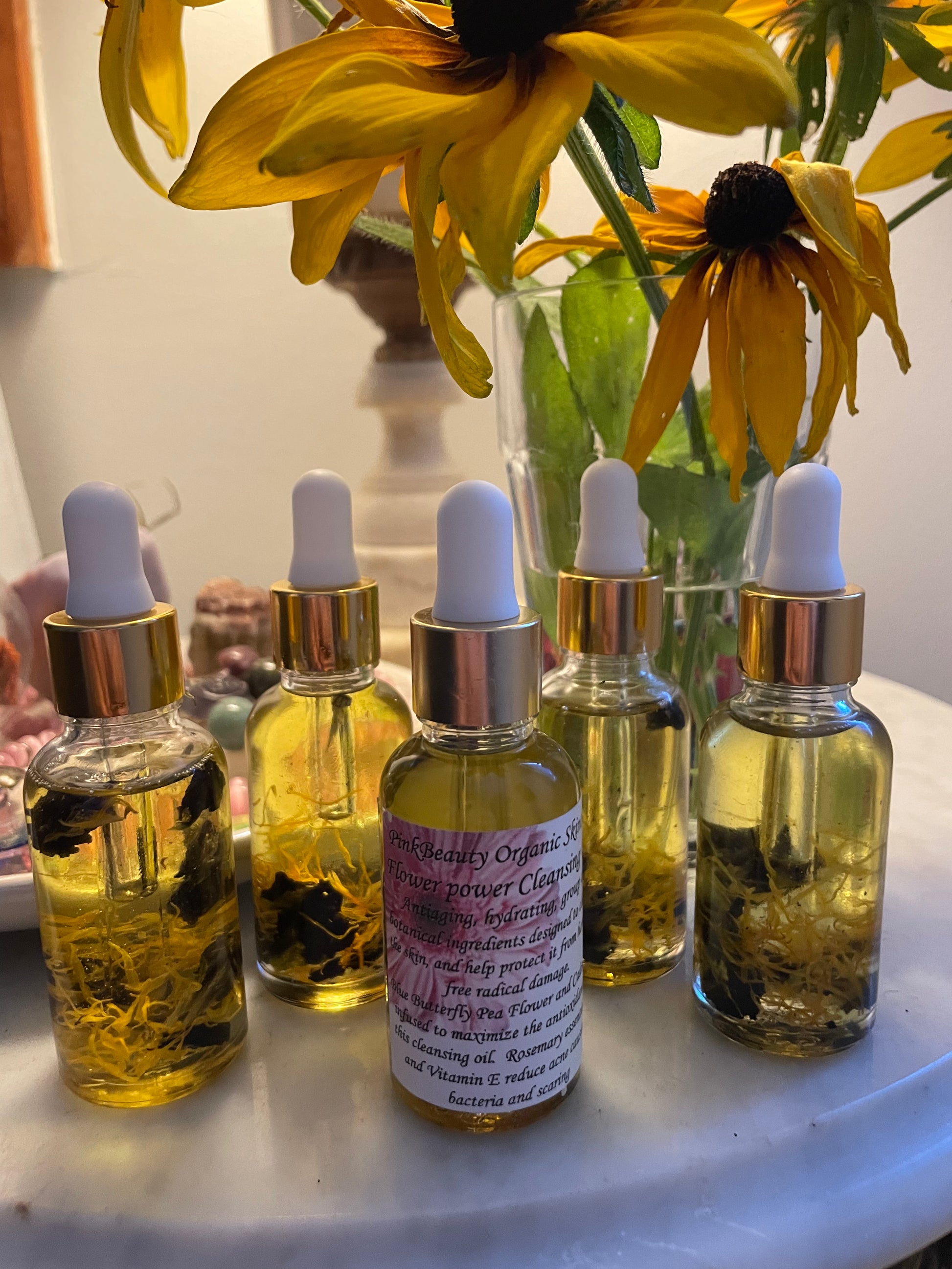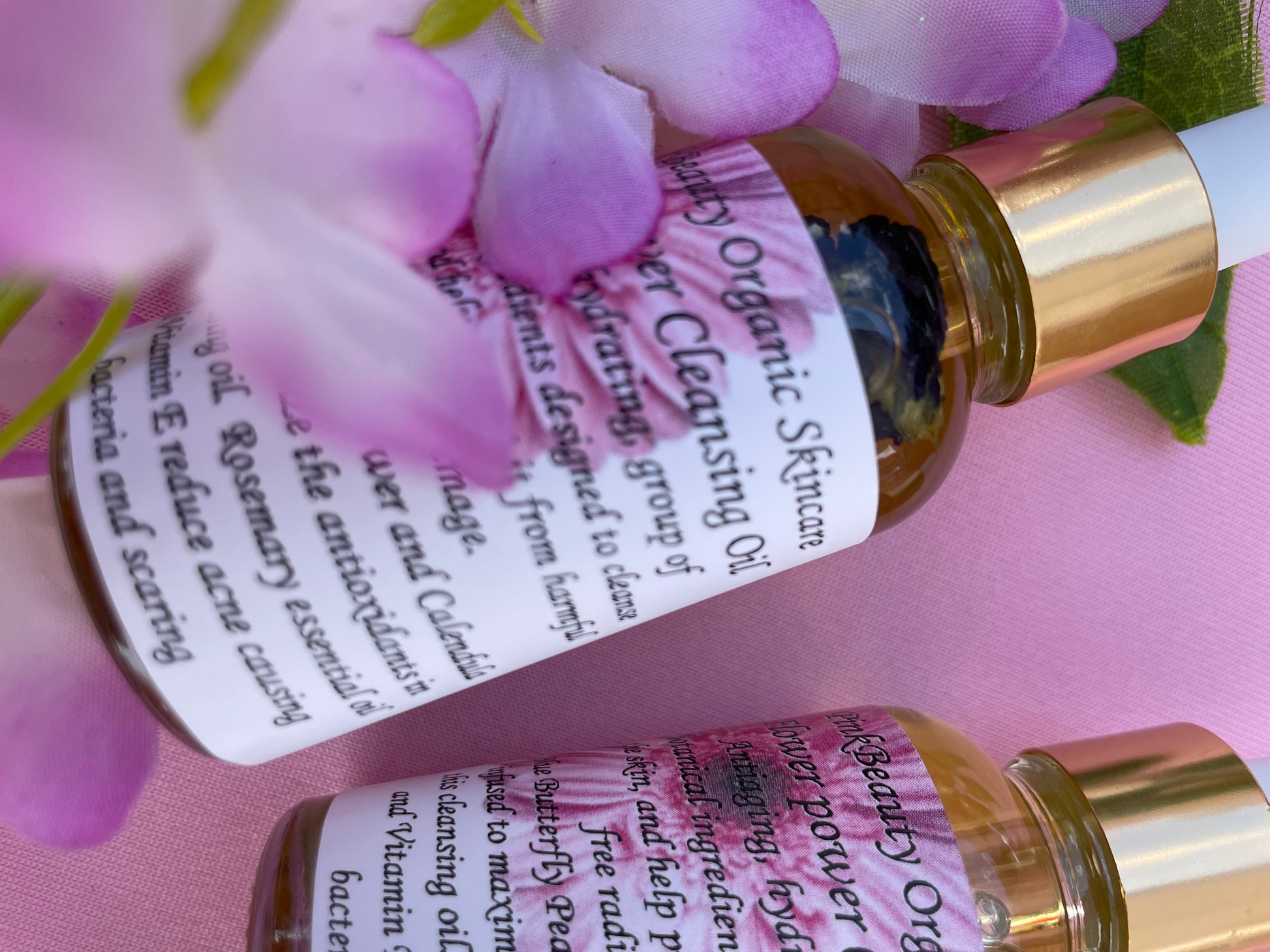 Antiaging hydrating group of botanical ingredients design to cleanse the skin to help protect it from harmful free radical damage blue butterfly pea flower and Calen Doula infused to maximize the antioxidants in this cleansing oil rosemary essential oil in vitamin E reduce acne causing bacteria and scaring