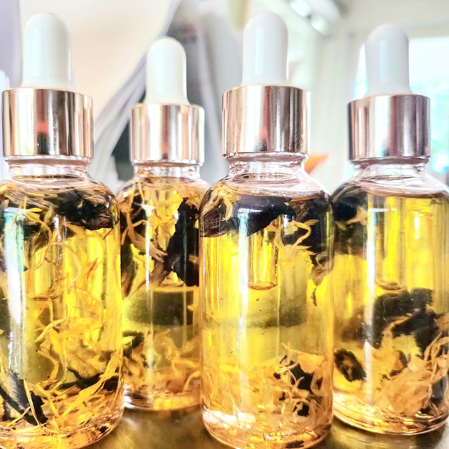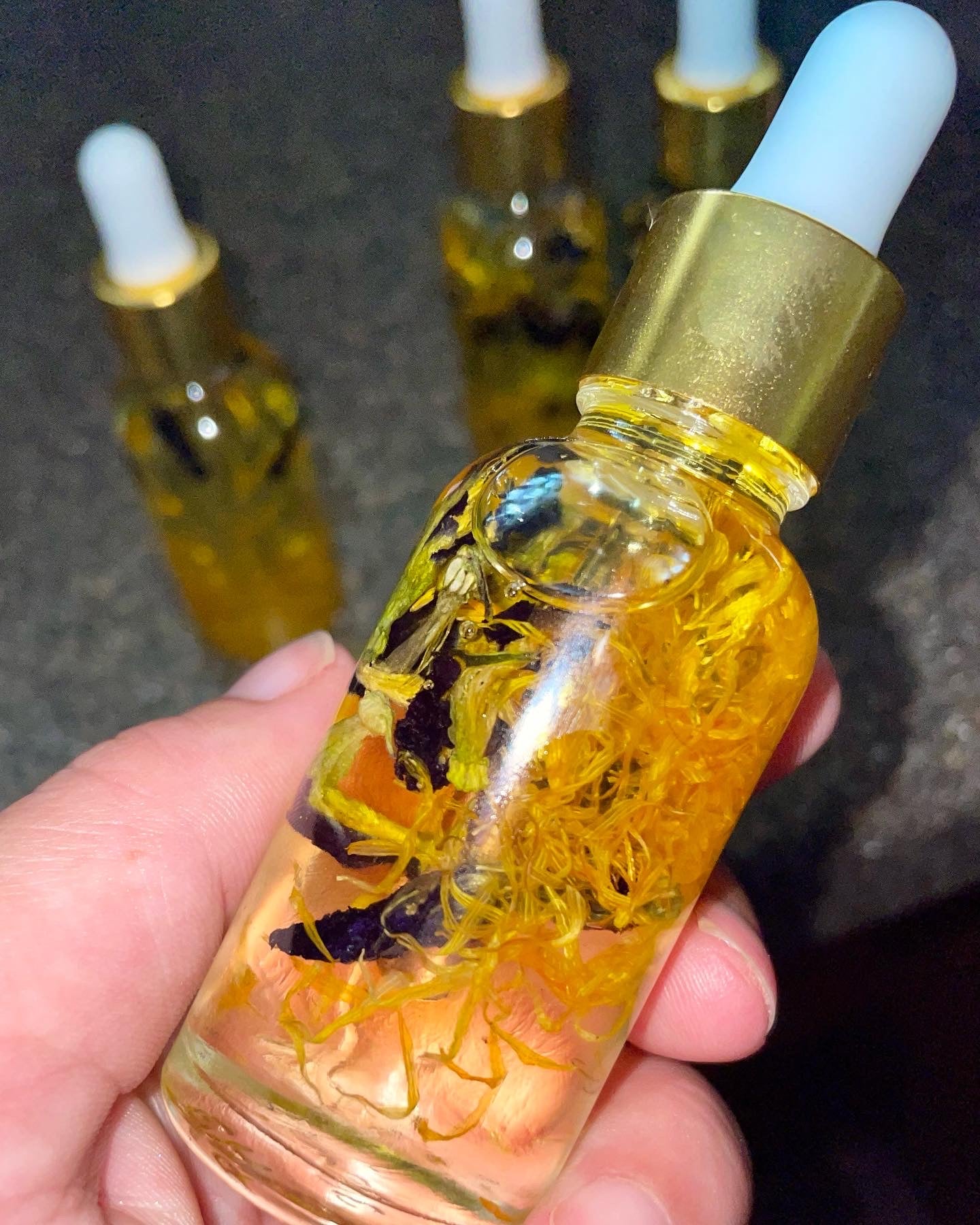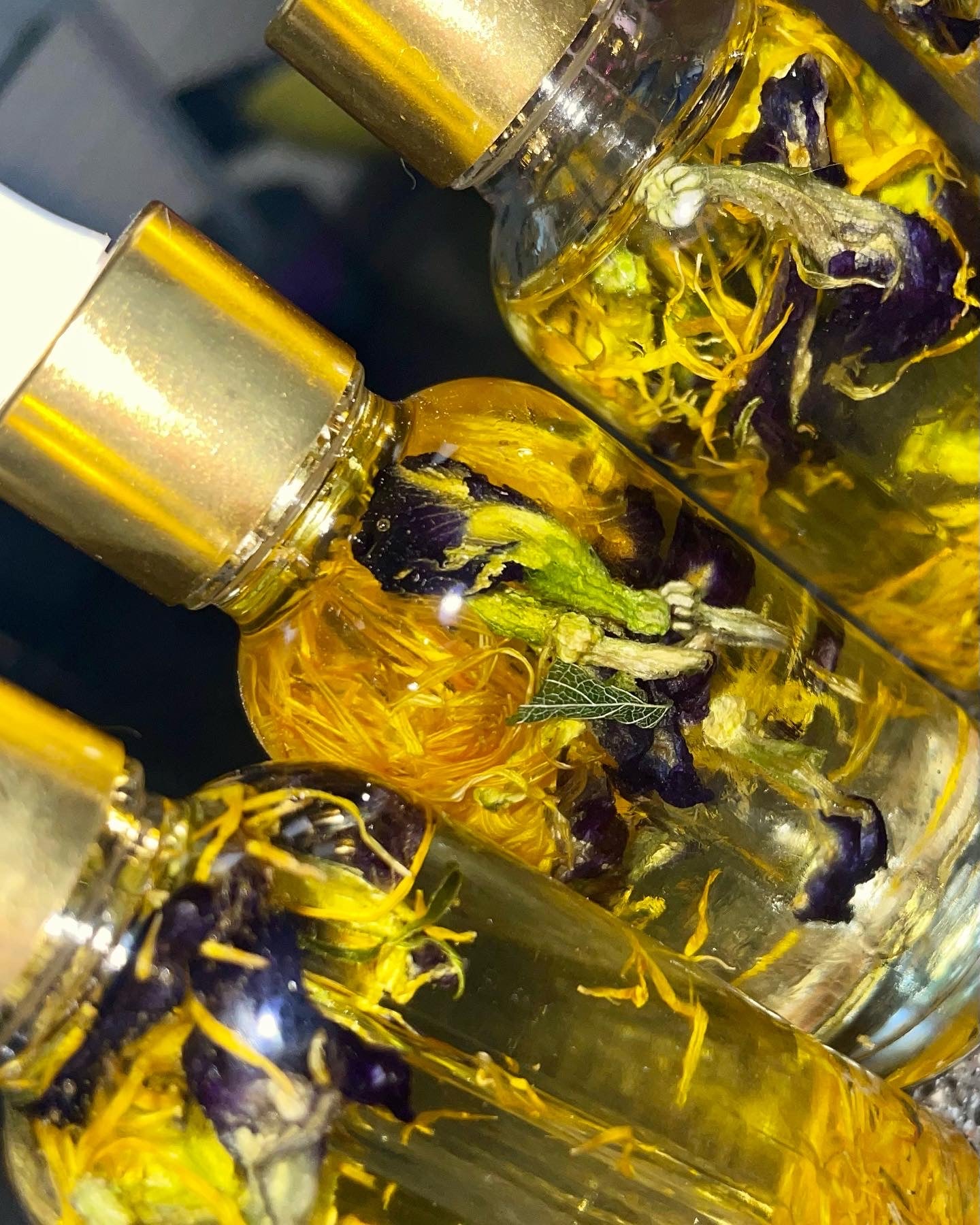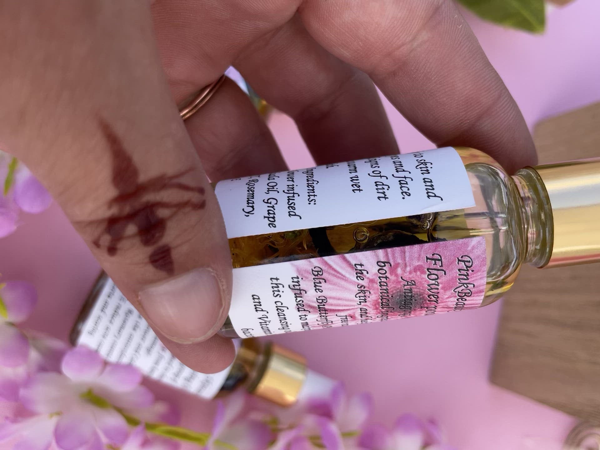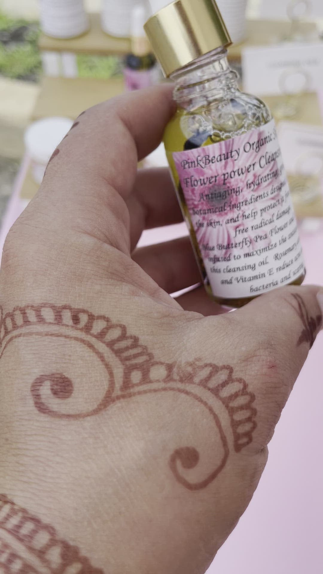Antiaging hydrating group of botanical ingredients design to cleanse the skin to help protect it from harmful free radical damage blue butterfly pea flower and Calen Doula infused to maximize the antioxidants in this cleansing oil rosemary essential oil in vitamin E reduce acne causing bacteria and scaring